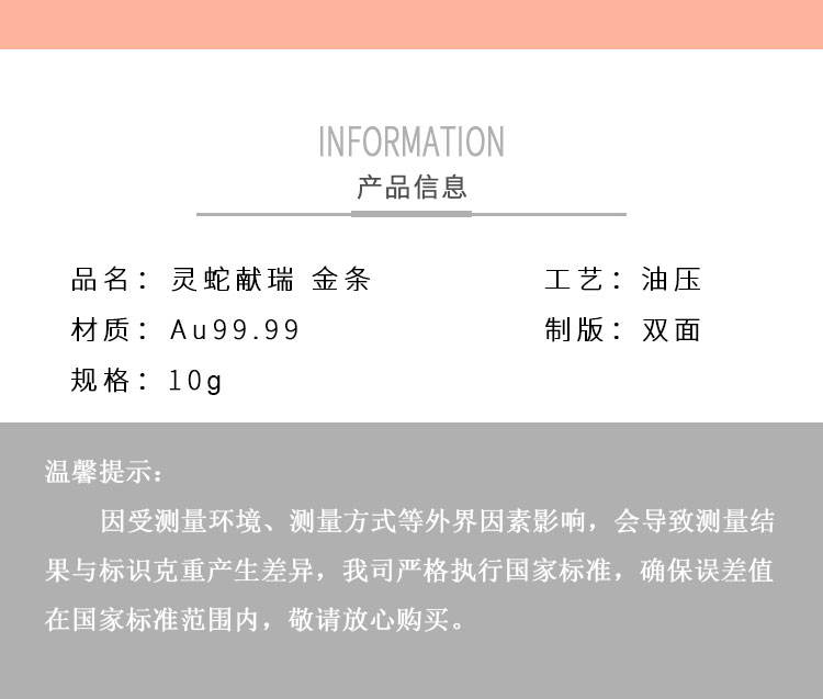 靈蛇獻(xiàn)瑞10克生肖金條,正面為一條盤繞花叢,望月昂首的金蛇造型。金蛇身披圖案為代表神圣的蟠虺紋、明月,代表健康長壽的東海水和鯨魚紋,代表財(cái)富的金錢樹紋和周圍的牡丹圖案,此謂靈蛇獻(xiàn)瑞主題。整體設(shè)計(jì)寓意增長學(xué)識(shí)與能力,財(cái)源通達(dá),健康長壽的美好祝愿。