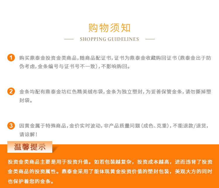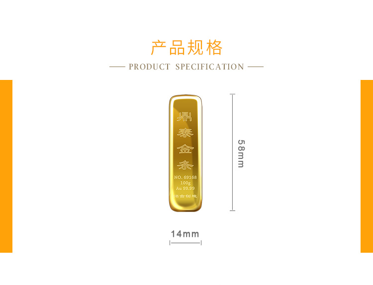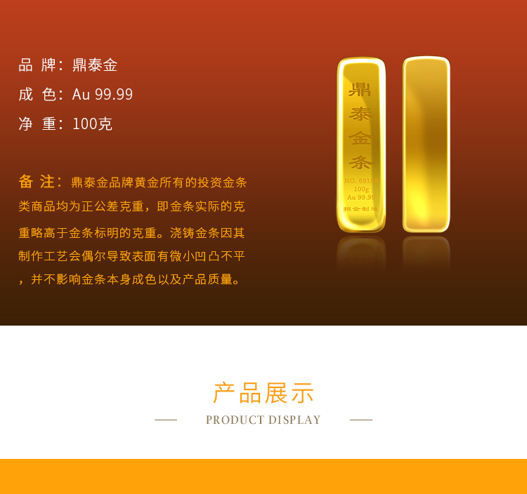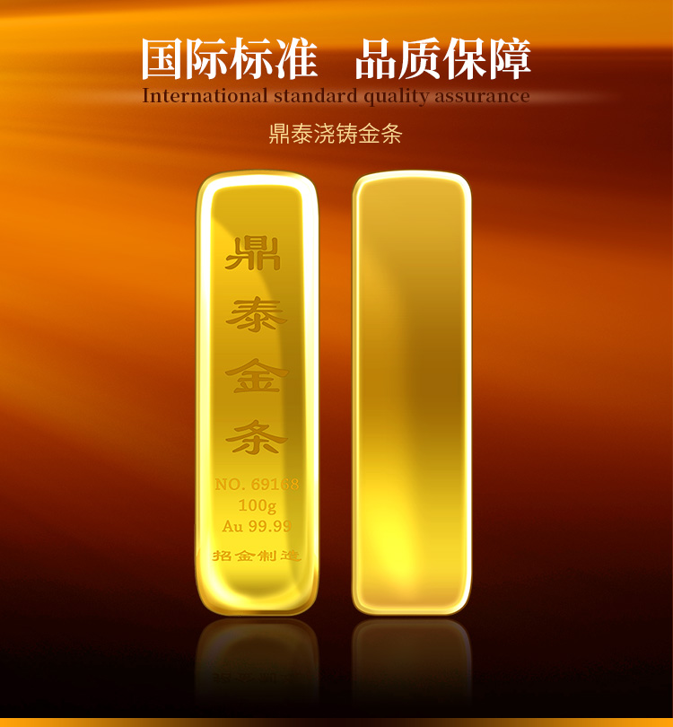 出品品牌為“鼎泰金”,經(jīng)澆鑄工藝制作,外觀圓潤(rùn),色度飽滿,全流程嚴(yán)格按照上海黃金交易所標(biāo)準(zhǔn)制造完成,支持購(gòu)回。金條正面標(biāo)注成色、克重、編號(hào)等標(biāo)識(shí)。