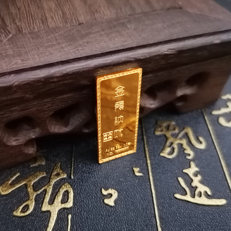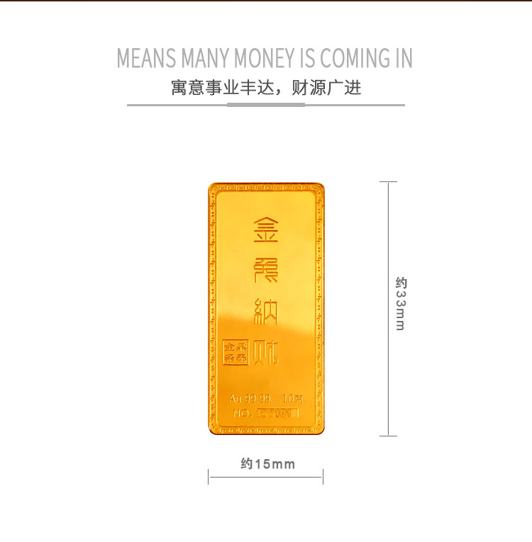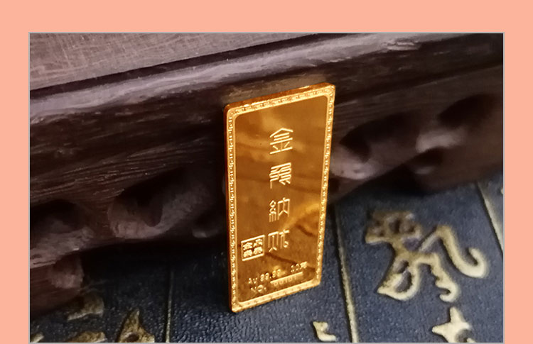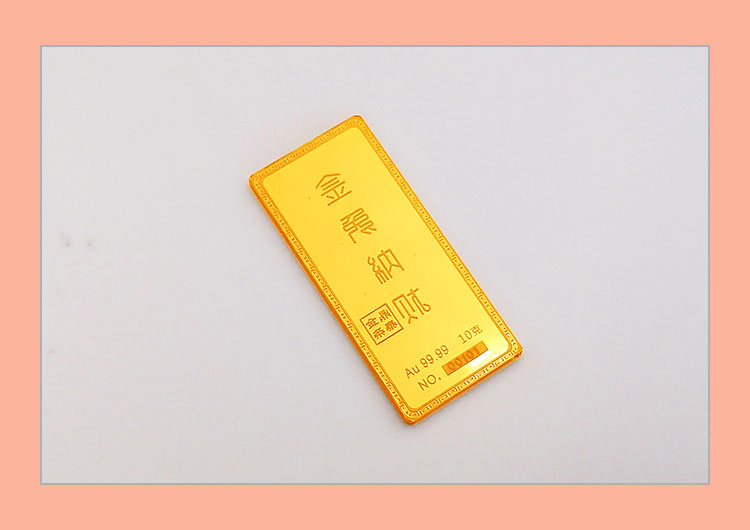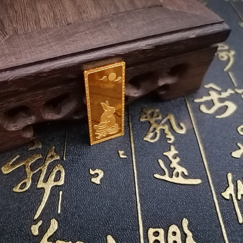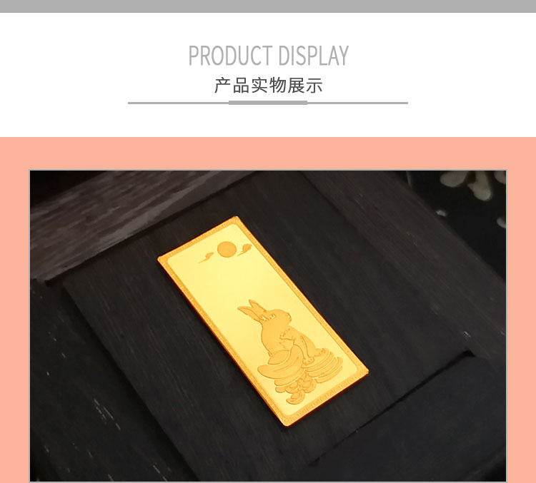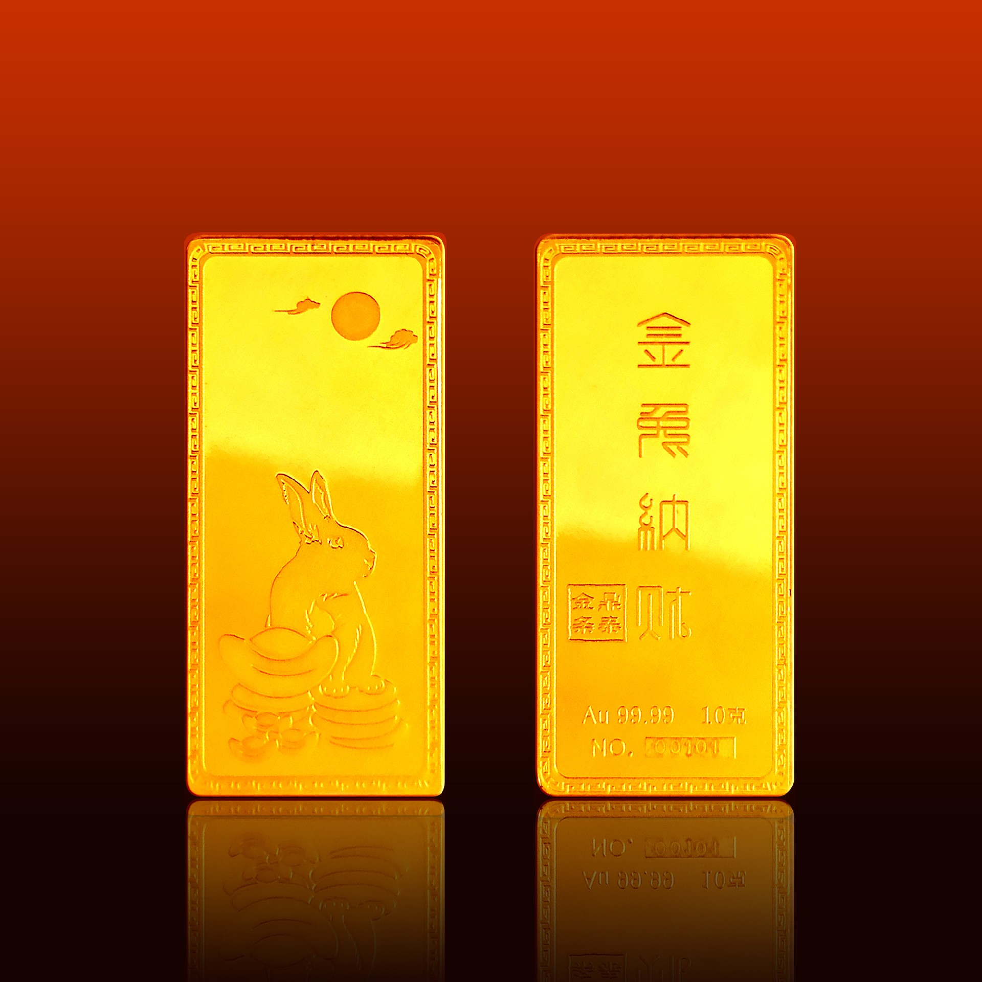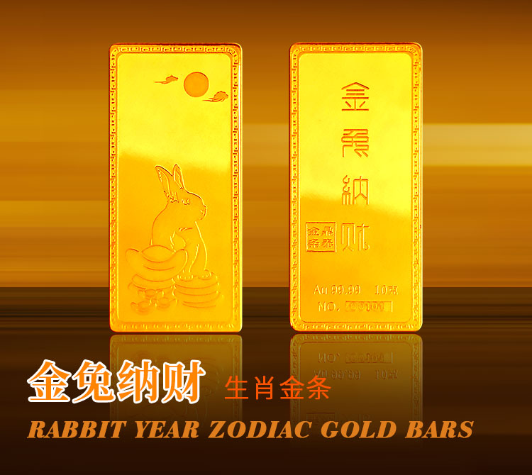 金兔納財系列金條產(chǎn)品,采用油壓工藝制造。正面圖案為一只兔子蹲坐于金錢堆上,面前擺放起元寶的造型,兔子形態(tài)機敏警惕,頭頂有環(huán)繞祥云的明月照耀。反面金兔納財四字居中,鼎泰金條印章在旁,下方標(biāo)注有金條成色、克重、編號等。整體設(shè)計寓意理財有道,納財有方,事業(yè)豐順,受福祿而身心靈動安康,鴻福綿長的美好祝愿。金條整體為鏡面底,圖案采用浮雕細(xì)砂工藝,對比效果清析,十分美觀。