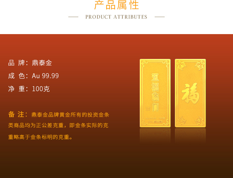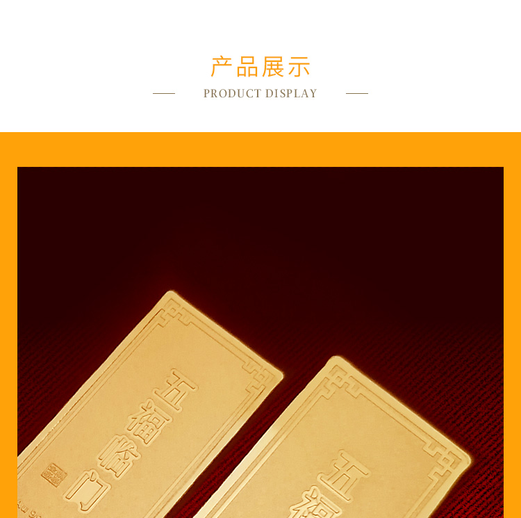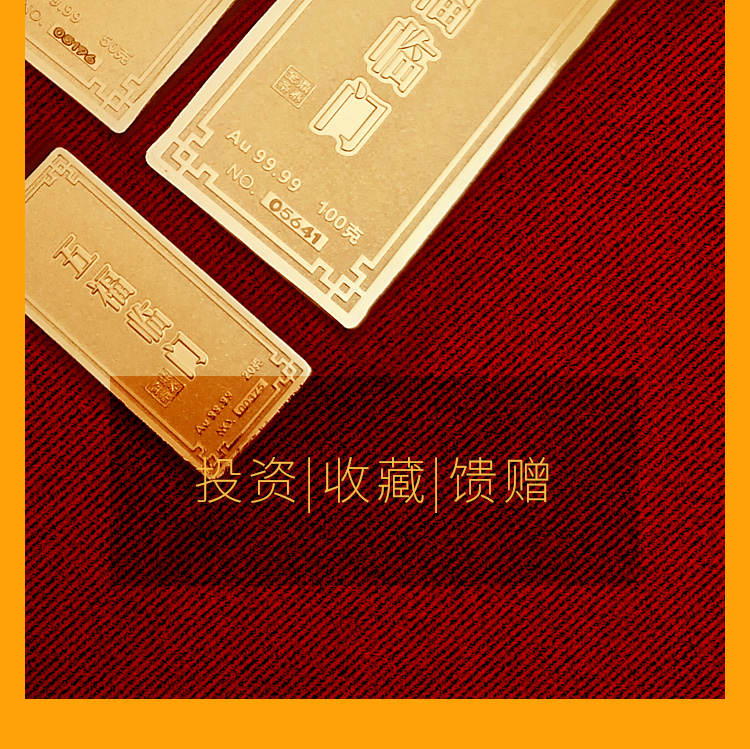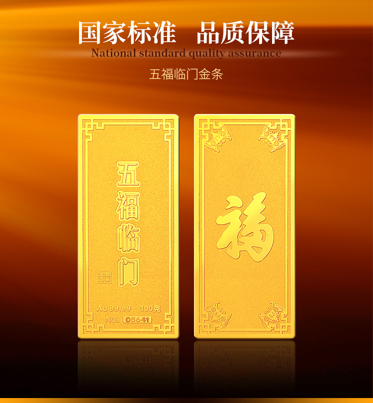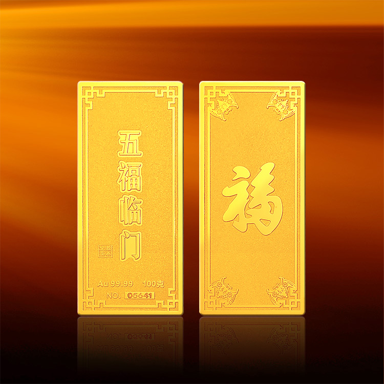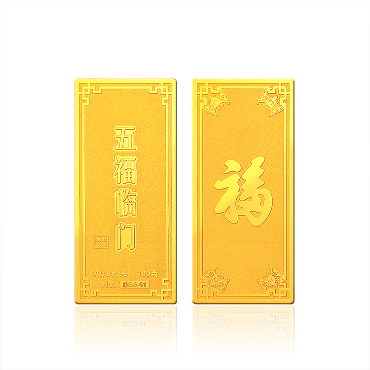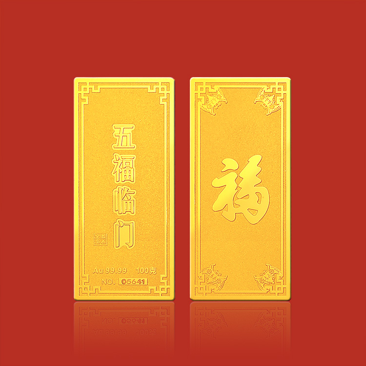 五福臨門系列金條產(chǎn)品,采用油壓工藝制造。正面圖案以康熙手書天下第一福的福字為主題,與四周向心蝙蝠(通福)構(gòu)成五福臨門的美好寓意,反面有五福臨門文字主題及金條成色,克重,編號等標(biāo)示。