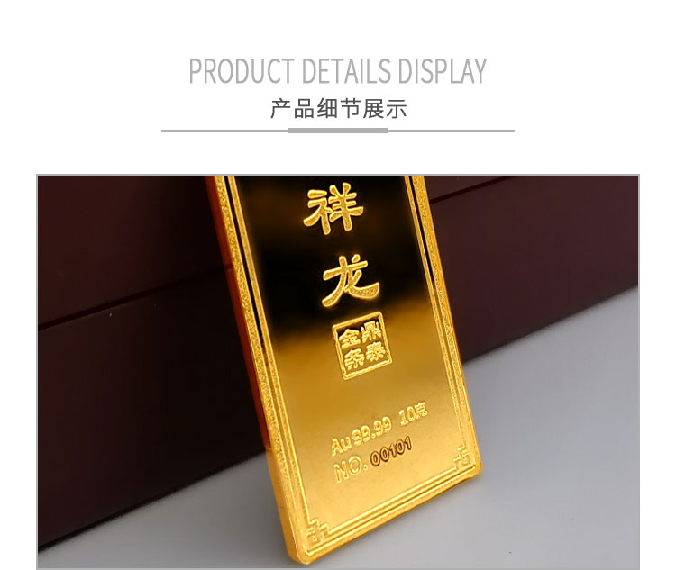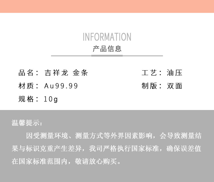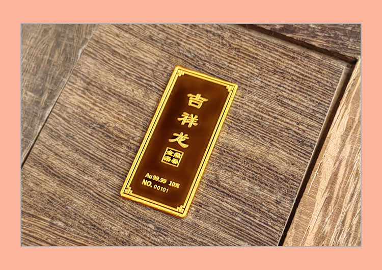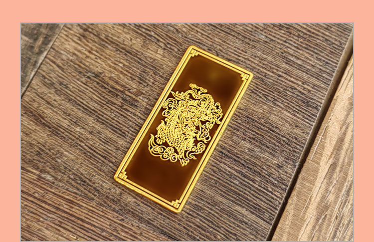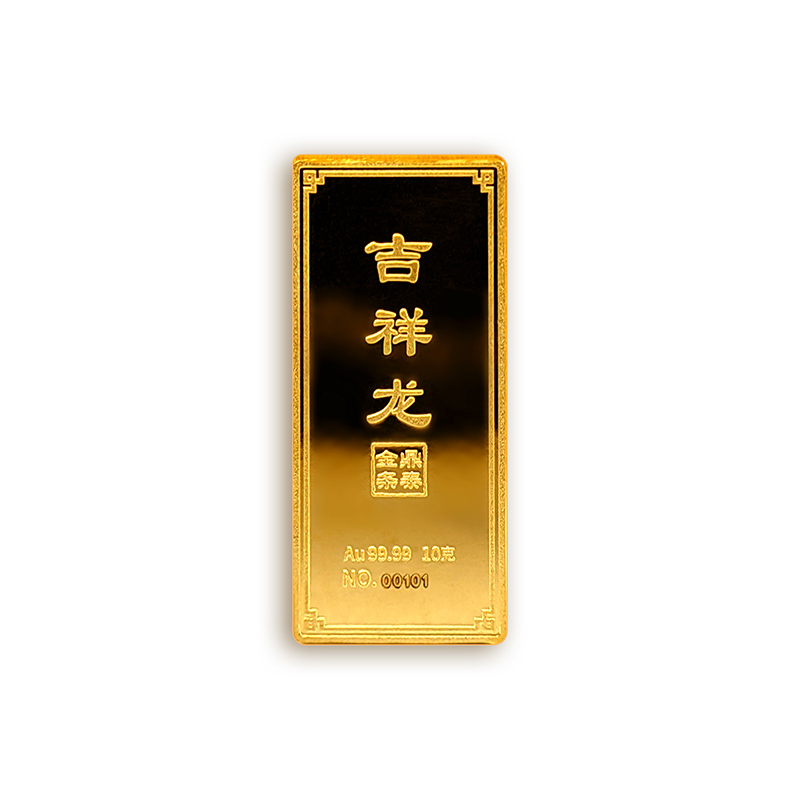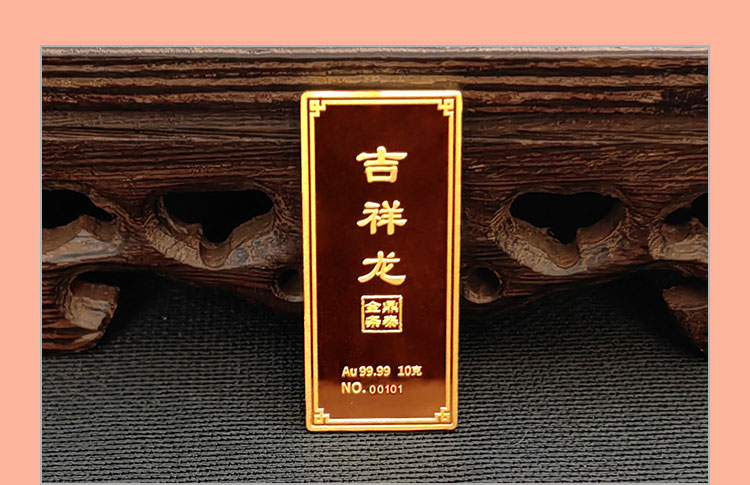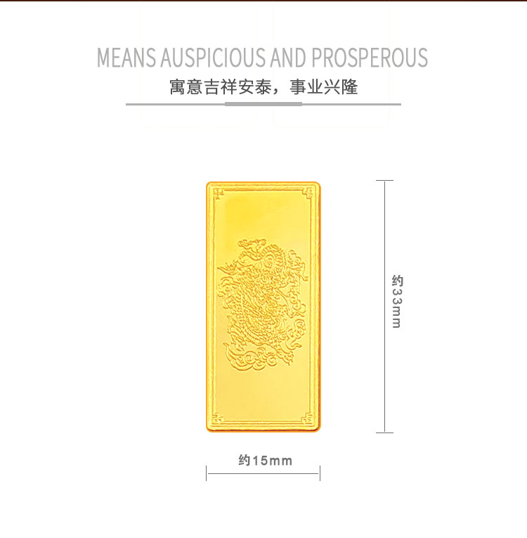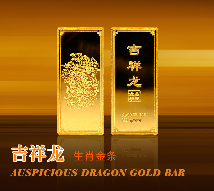吉祥龍生肖金條以云中行龍,龍游云從為設計主題,采用油壓工藝制造。金條正面主體為祥云之間的一條金龍,游走于云海之中睥睨天下的造型。龍形為下探游龍,,身姿彎蜒,健美有力。身邊為祥云簇擁環(huán)繞,鱗甲飛揚。反面吉祥龍三字居中,四周回角邊,下方標注有金條成色、克重、編號等。整體設計寓意龍行天下,財通八方,事業(yè)興旺發(fā)達的美好祝愿。