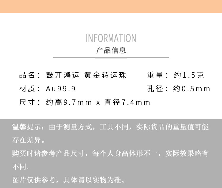 黃金轉(zhuǎn)運(yùn)珠佩戴時(shí),隨著肢體動(dòng)作不停轉(zhuǎn)動(dòng),寓意為佩戴者時(shí)時(shí)轉(zhuǎn)運(yùn),使這好運(yùn)隨身。